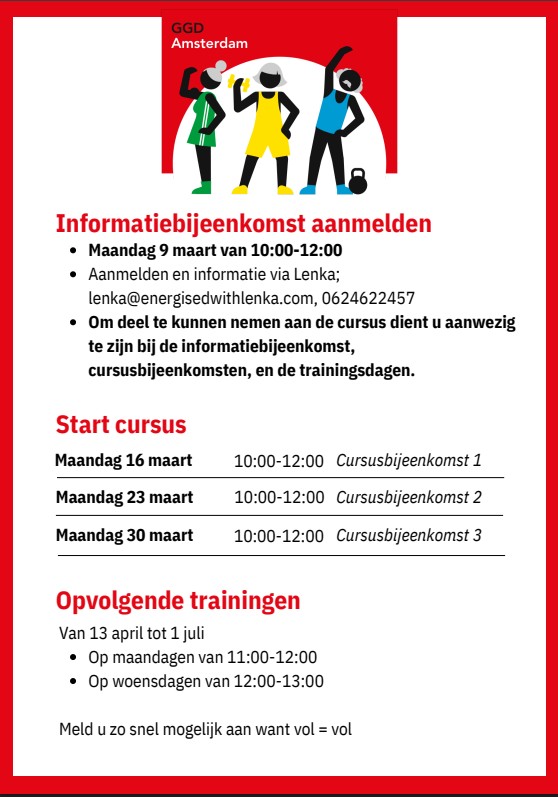 Aanwezigheid bij de informatiebijeenkomst, cursusbijeenkomsten en trainingen is noodzakelijk. Aanmelden kan via mij: